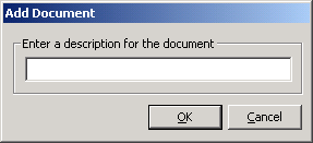 Inserting files into Folders in Virtual Office Information SQL is very easy. Once a Folder has been created, documents can are added by the simple click on a button. A prompt (shown right) will ask you for a description of the document.